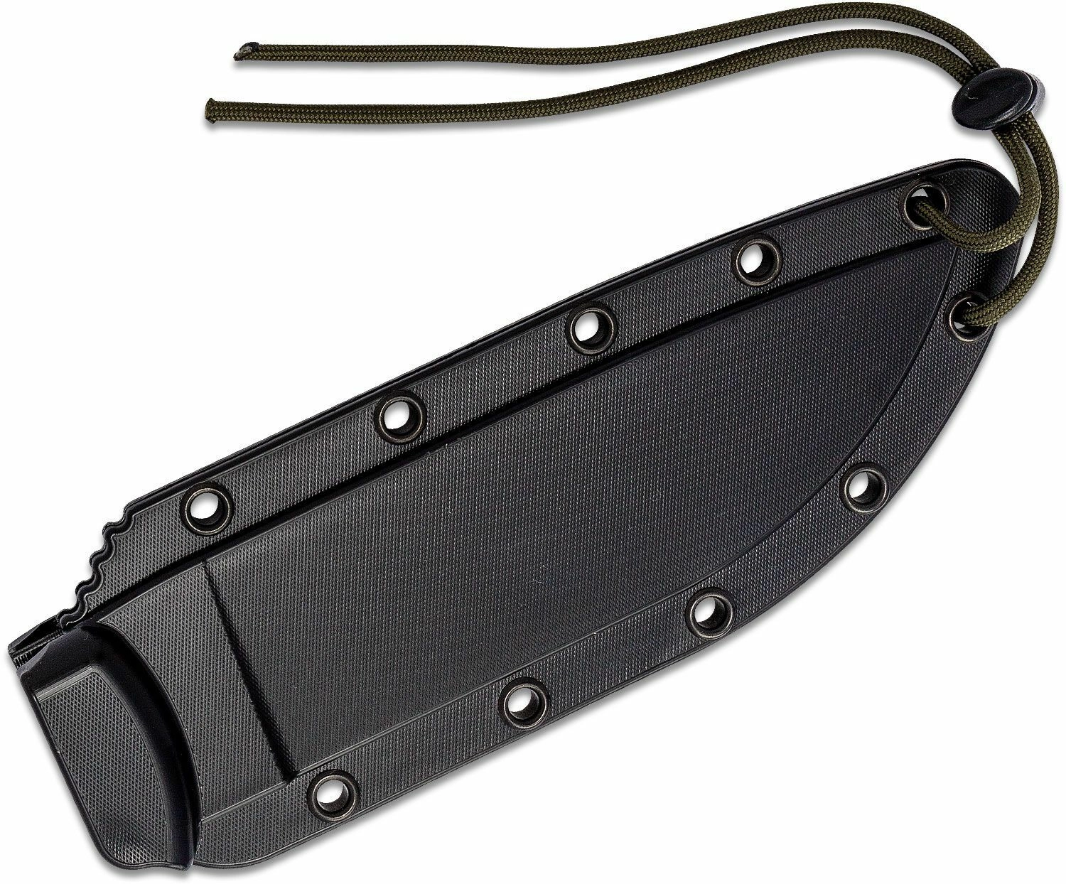 Tvarované plastové puzdro s viacerými prieťahmi a sponou na opasok umožňuje bezpečné uloženie noža a rôzne spôsoby uchytenia na výstroj.