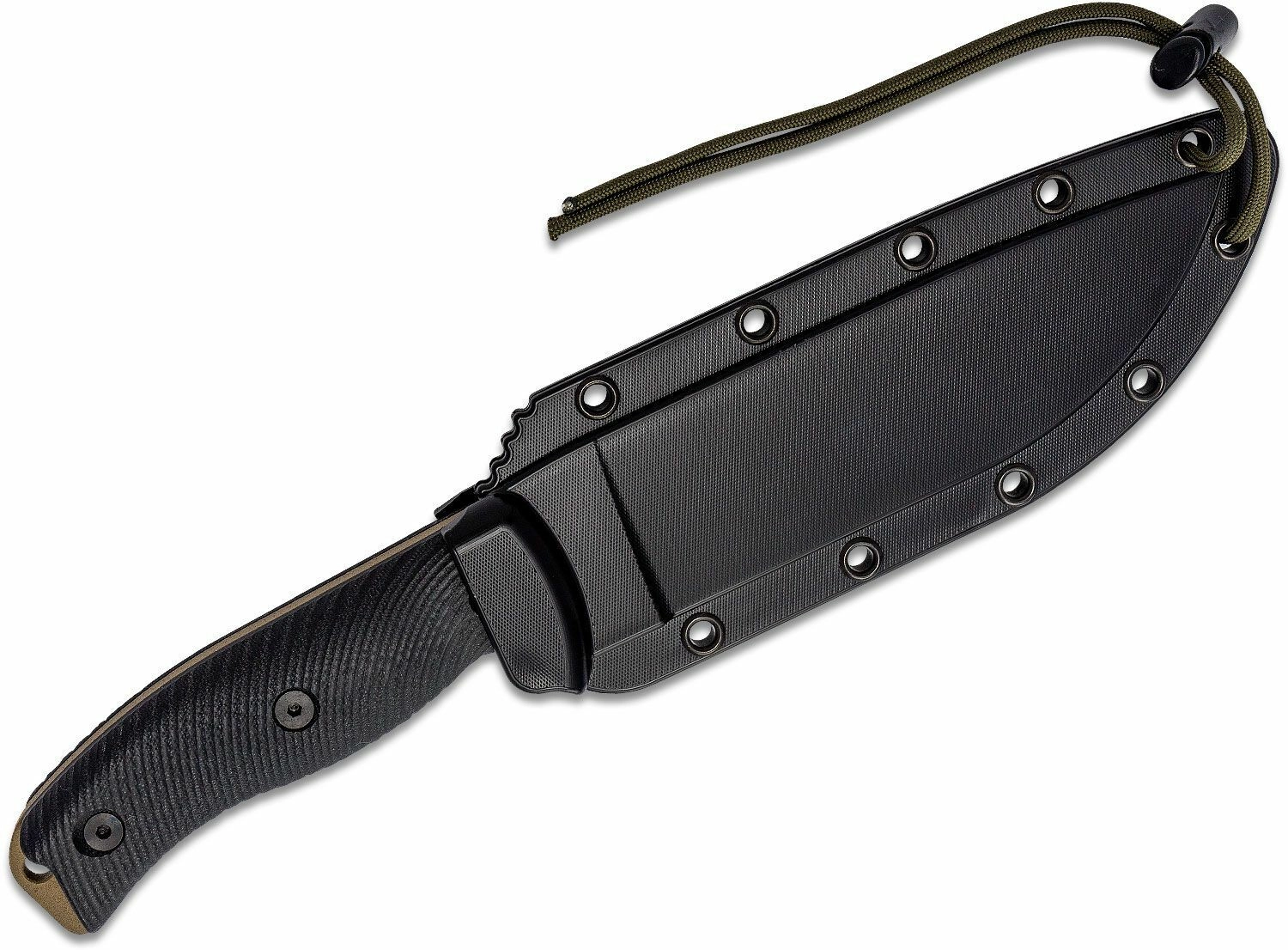Rukoväť z G10 je 3D profilovaná a textúrovaná pre istý úchop aj v rukaviciach alebo za mokra. Konštrukcia full tang dodáva nožu výbornú stabilitu a životnosť. Na konci je otvor na šnúrku/lanyard na zabezpečenie alebo jednoduchšie vytiahnutie z puzdra.