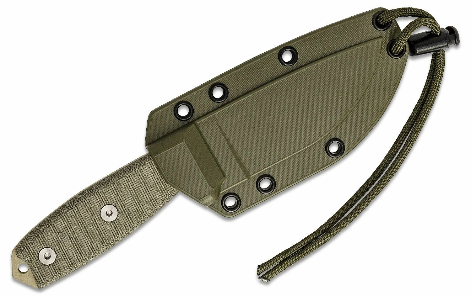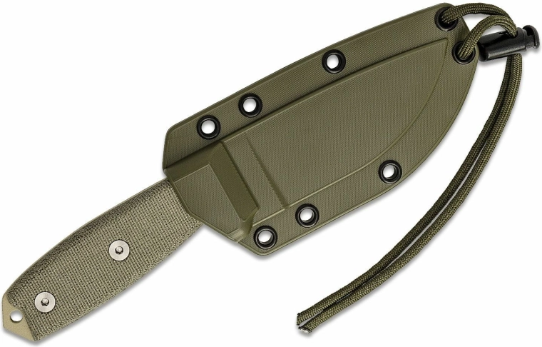 Ergonomická rukoväť z materiálu Micarta v pieskovo hnedom odtieni zabezpečuje istý úchop aj v náročných podmienkach. Nôž je vybavený otvorom na šnúrku a praktickým rozbíjačom skla na konci rukoväte. Súčasťou balenia je odolné plastové puzdro Desert Tan na bezpečné a rýchle nasadenie v teréne.