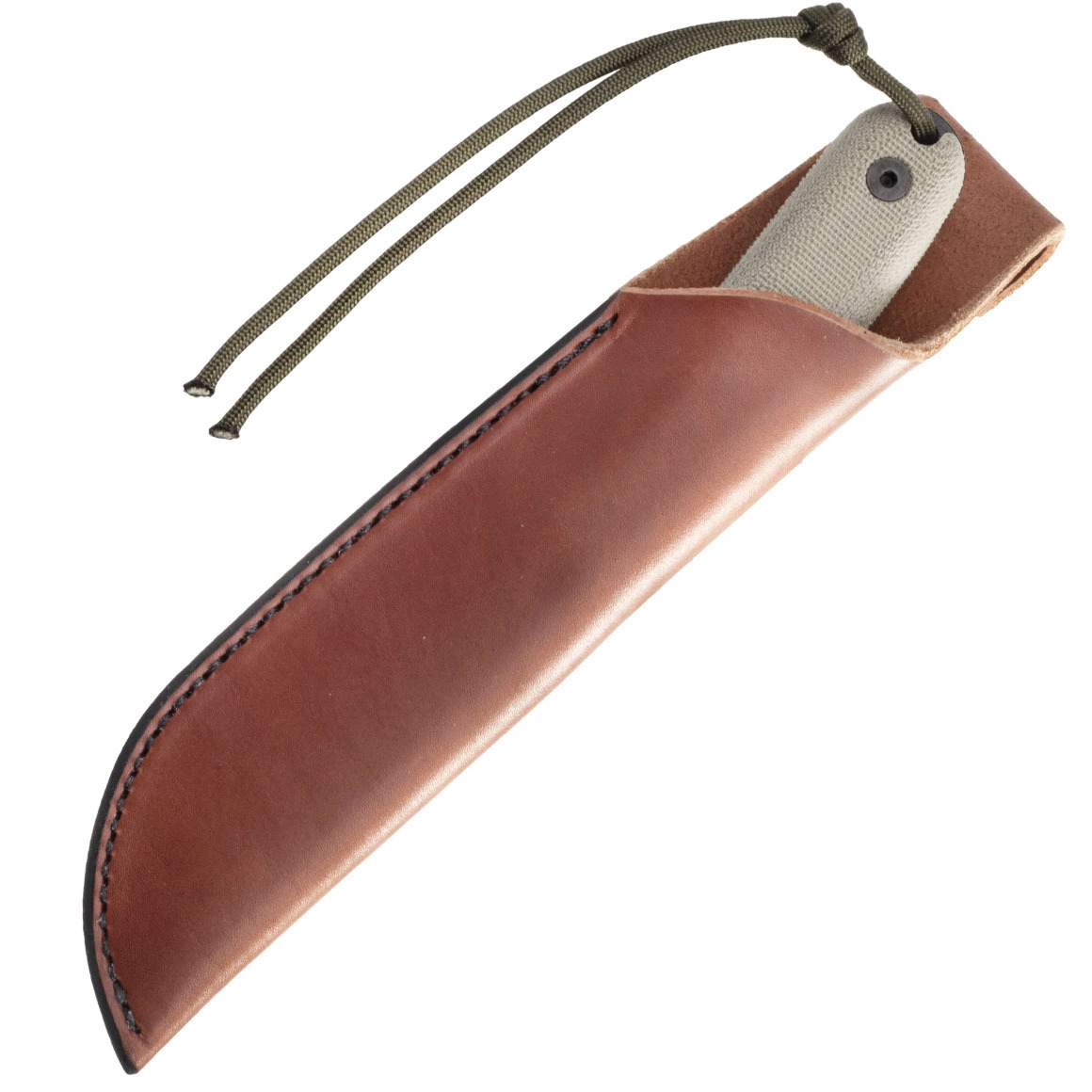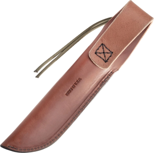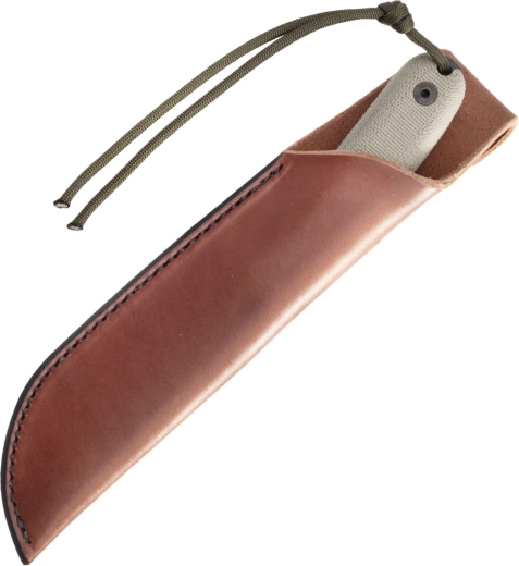 Ergonomická rukoväť z Micarty v olivovej farbe poskytuje istotu v mokre aj chlade, plná full tang konštrukcia zabezpečuje maximálnu pevnosť a kontrolu. Súčasťou je hnedé kožené puzdro s možnosťou nosenia na opasku, ktoré chráni čepeľ a uľahčuje prístup v teréne.