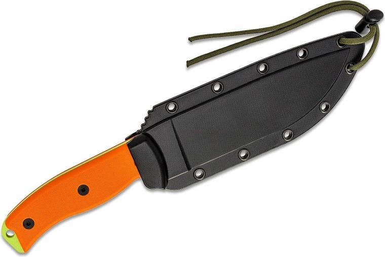 Ergonomická oranžová rukoväť z G10 poskytuje výbornú trakciu aj vo vlhku a jej výrazná farba uľahčuje rýchle nájdenie noža v teréne. Vďaka otvoru pre šnúrku možno pridať bezpečnostné lanko. K nožu je dodávané odolné polymérové puzdro s viacerými možnosťami uchytenia na bezpečné a pohodlné nosenie.
