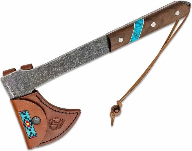 Ľahký a odolný tomahawk na pobyt v prírode. Hlava z uhlíkovej ocele 1075 s prírodnou povrchovou úpravou, priebežná konštrukcia full-tang a ergonomická rukoväť z orechového dreva s prvkami tyrkysového kameňa. Súčasťou je kvalitné kožené puzdro. Ideálny na kempovanie, bushcraft a outdoorové aktivity. Uhlíková oceľ 1075, full-tang konštrukcia, orechové drevo, kožené puzdro v balení.