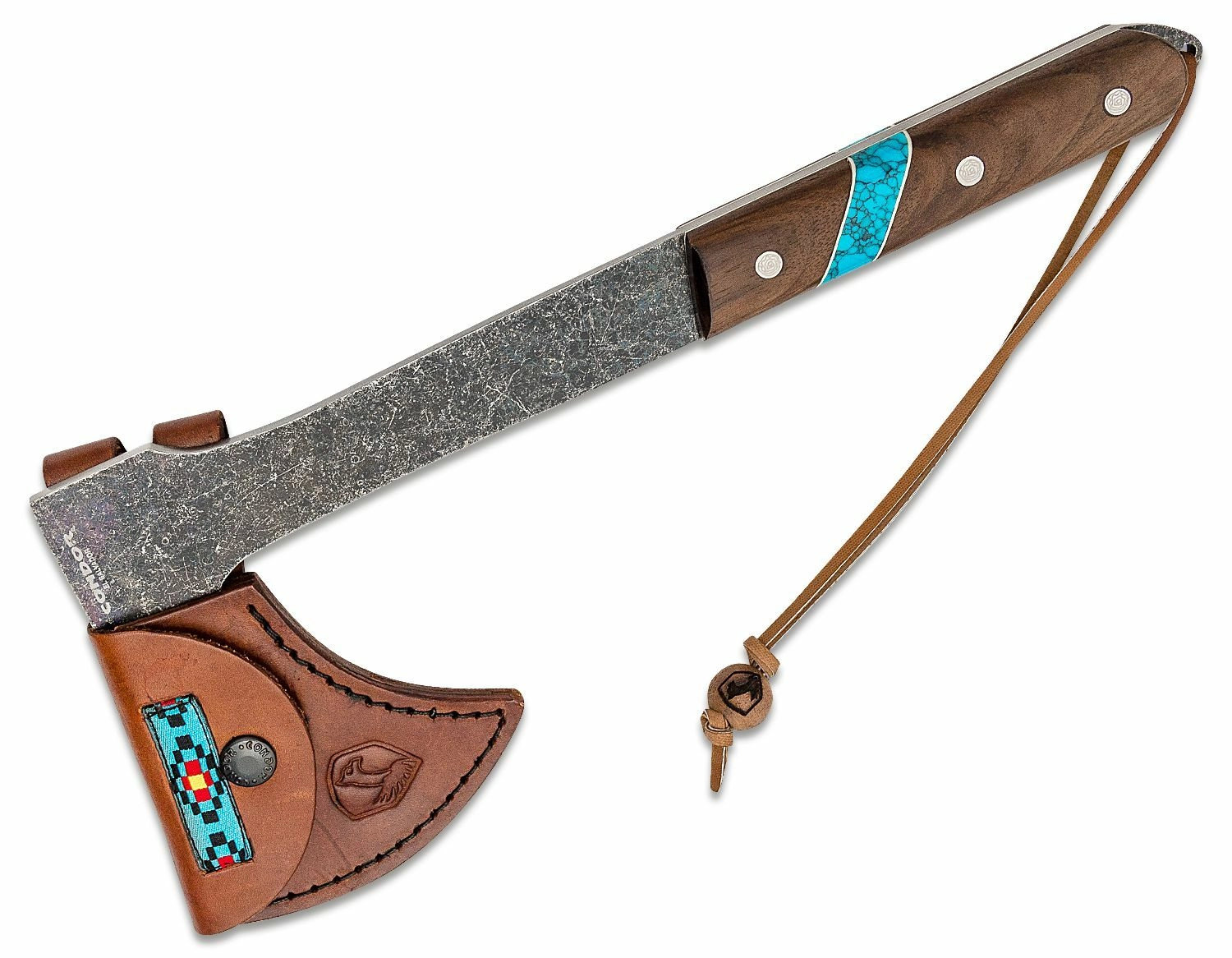 Vďaka hlave z uhlíkovej ocele 1075 s prírodnou povrchovou úpravou a priebežnej (full‑tang) konštrukcii získate vysokú pevnosť, odolnosť a dlhú životnosť. Rukoväť z orechového dreva s dekoratívnym tyrkysovým kameňom poskytuje istý úchop aj v náročných podmienkach; praktické očko umožňuje doplniť šnúrku pre bezpečnejšiu manipuláciu. Na bezpečné prenášanie je v balení kožené puzdro.