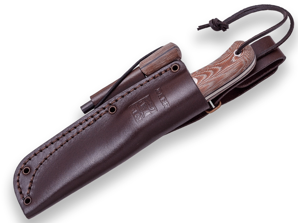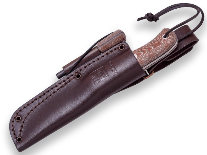 Rukoväť z kompozitného materiálu Micarta v hnedom prevedení výborne drží aj za vlhka a je doplnená otvorom pre šnúrku. V teréne oceníte kvalitné kožené puzdro pre bezpečné nosenie a integrované kresadlo pre jednoduché zakladanie ohňa.