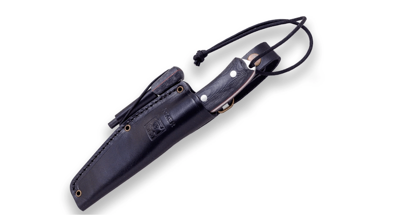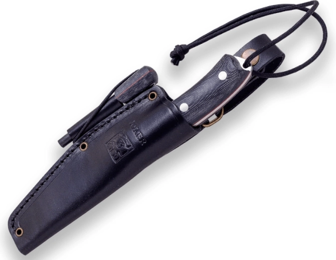 Rukoväť z Micarty v čiernom prevedení s červenými prvkami skvele sedí v ruke aj za mokra. Nôž dopĺňa kvalitné kožené puzdro na bezpečné nosenie, praktické kresadlo na zakladanie ohňa a paracord (2 m) pre núdzové situácie v prírode.