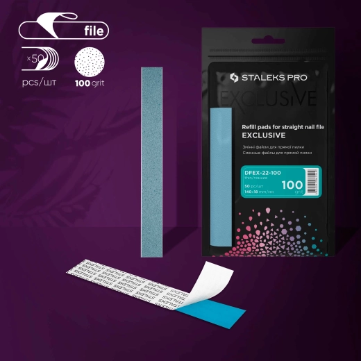 Jednorazové pilníky STALEKS s hrubosťou 100 grit na rýchle tvarovanie a vyhladenie nechtovej platničky. Vyrobené z prémiového švajčiarskeho brúsiva na spoľahlivom samolepiacom podklade, tenké a presné pre manikúru aj pedikúru. Vhodné pre systémy MBE-20s, MBE-20, SPBE-20, WBE-20.