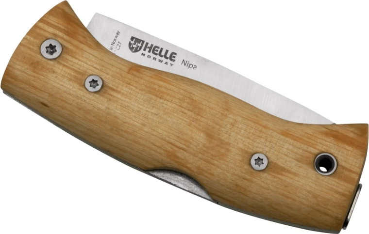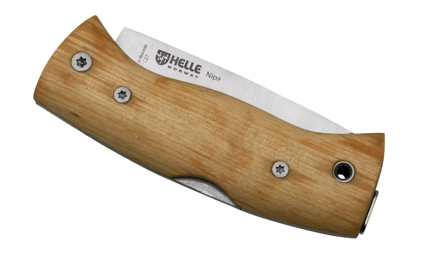 Elegantný škandinávsky zatvárací nôž HELLE Nipa na bushcraft, poľovanie aj každodenné nosenie. Ponúka čepeľ z nehrdzavejúcej ocele 12C27 s hladkým ostrím, bezpečnostnú poistku Backlock a ergonomickú rukoväť z kučeravej brezy s klipsom a otvorom na šnúrku.