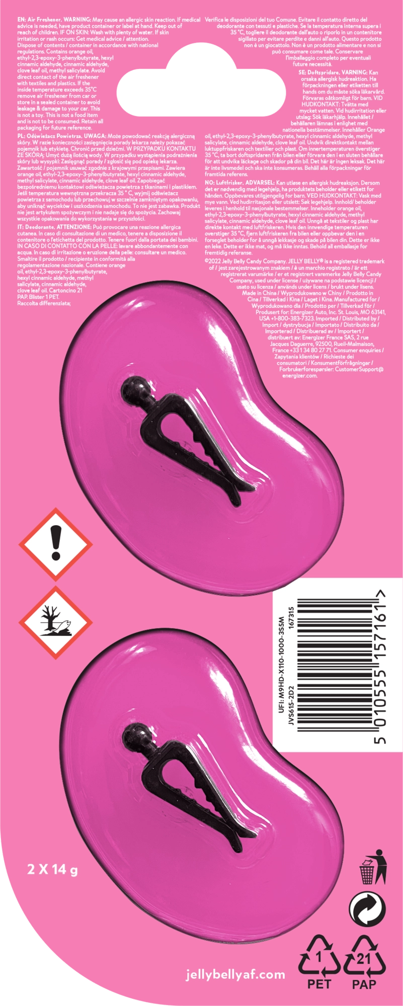 Doprajte si hravú vôňu žuvačky s osviežovačom vzduchu Jelly Belly Vent Clip-On. Jednoducho ho pripnite do ventilačnej mriežky v aute, doma či v kancelárii a užite si intenzívnu vôňu až 30 dní. Balenie DUO obsahuje dva fazuľkové klipy pre ešte výraznejšie prevoňanie.