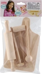 Set je vyrobený z kvalitného dreva s hladkým povrchom pre pohodlné a bezpečné používanie. Vďaka univerzálnym kúskom – doske, valčeku a tĺčiku – deti ľahko napodobnia prípravu jedla a naučia sa základným kuchynským činnostiam.