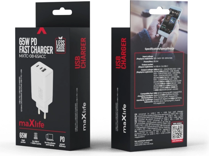 Hľadáte kompaktnú a výkonnú nabíjačku pre všetky svoje zariadenia? Maxlife 65W ponúka špičkové rýchlonabíjanie s podporou PD a QC, takže si poradí s modernými smartfónmi, tabletmi aj vybranými notebookmi s USB‑C. Tri výstupy (2× USB‑C, 1× USB‑A) zabezpečujú pohodlné a bezpečné napájanie viacerých zariadení naraz.