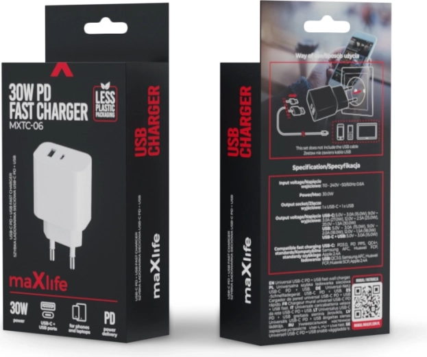 Kompaktná sieťová nabíjačka MAXLIFE s výkonom 30 W ponúka rýchle a bezpečné nabíjanie viacerých zariadení naraz. Vďaka portom USB‑C a USB‑A a podpore Power Delivery (PD) a Quick Charge (QC) automaticky prispôsobí výkon pripojenému zariadeniu pre čo najefektívnejšie nabíjanie.