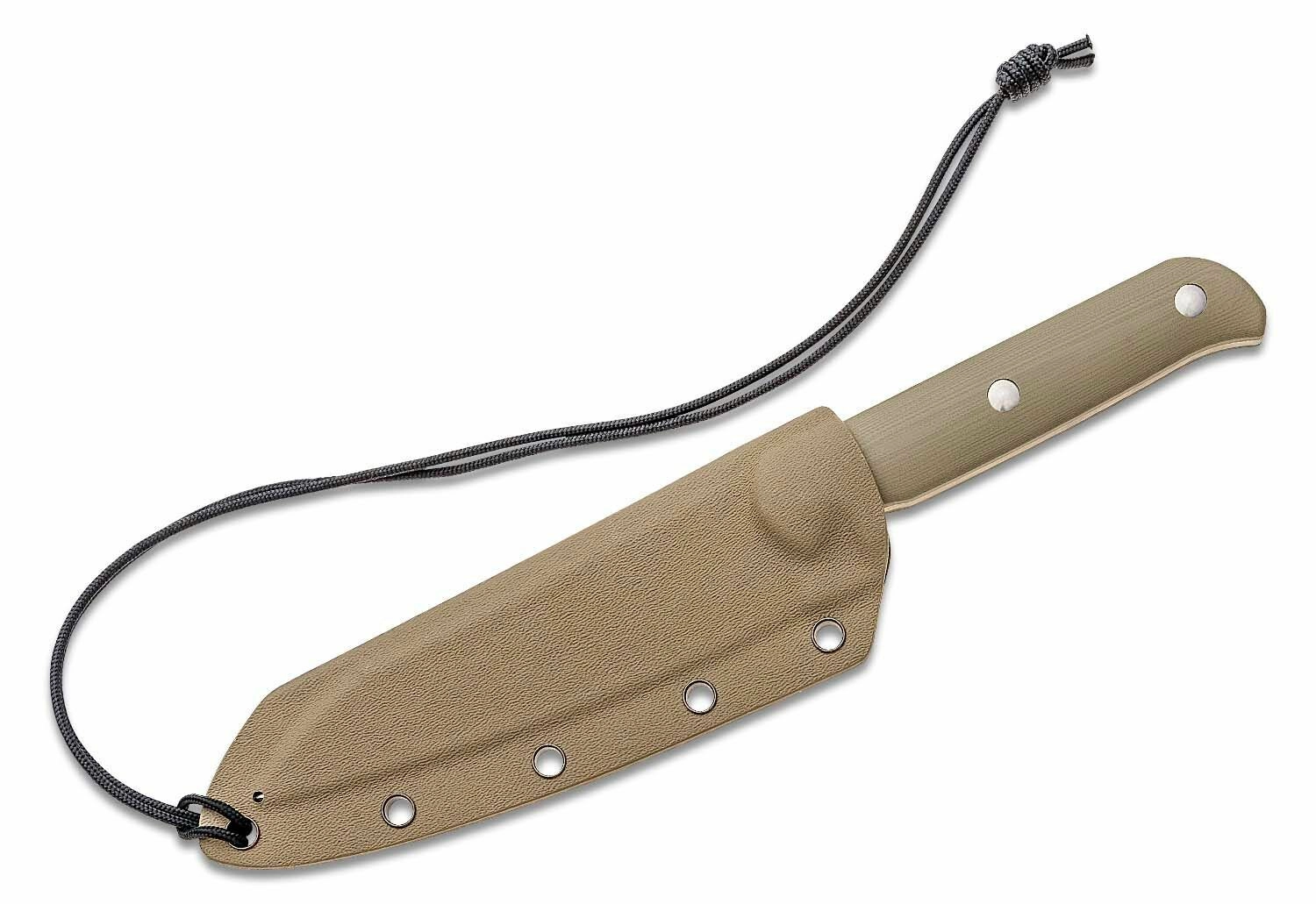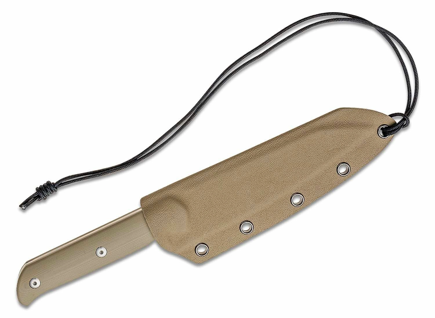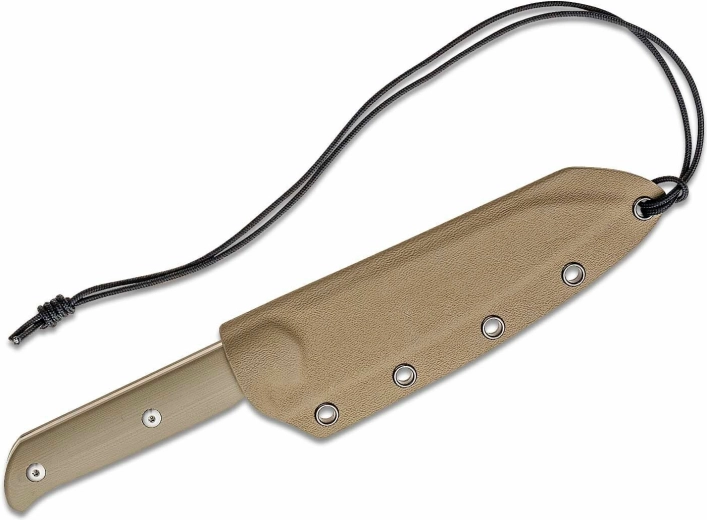 Ergonomická rukoväť z materiálu G10 v pieskovohnedej farbe istí úchop aj v náročných podmienkach. Plná konštrukcia s tromi nerezovými nýtmi zaručuje vysokú odolnosť a stabilitu. Kydexové puzdro so šnúrkou umožňuje bezpečné nosenie a rýchle tasenie, takže nôž máte vždy po ruke.