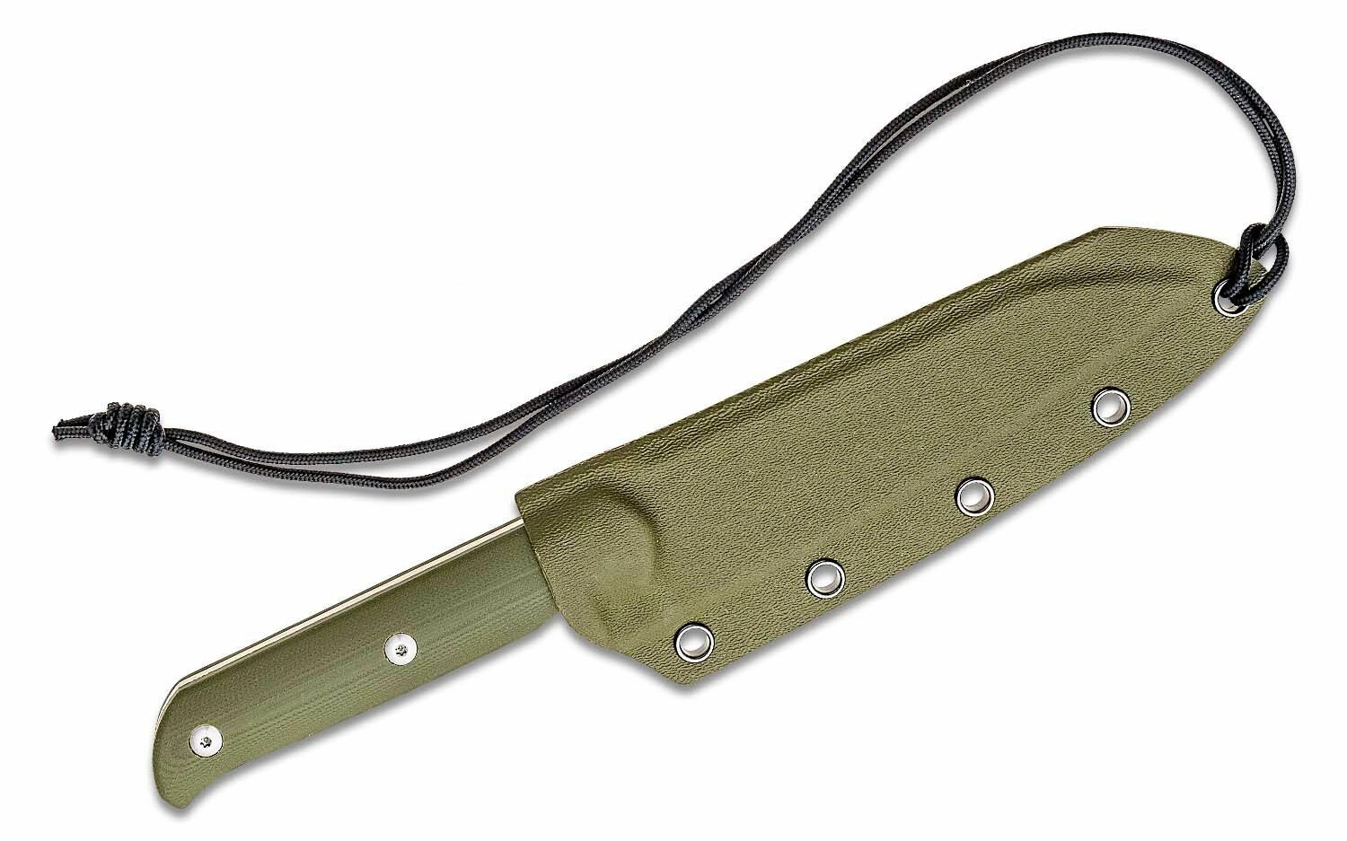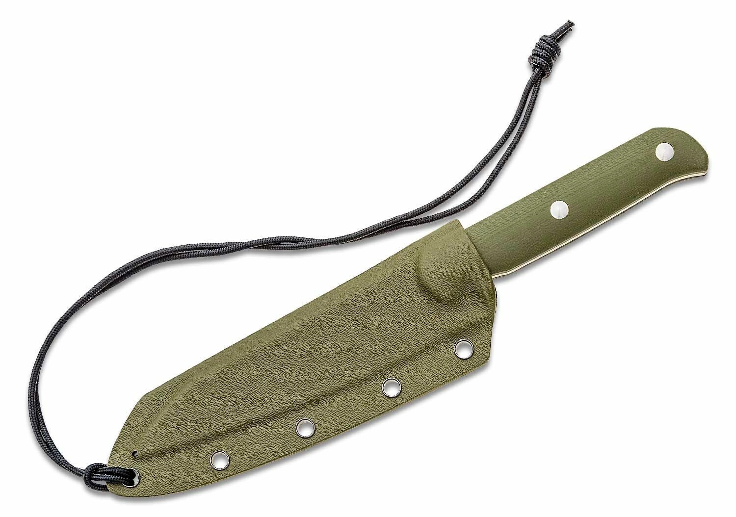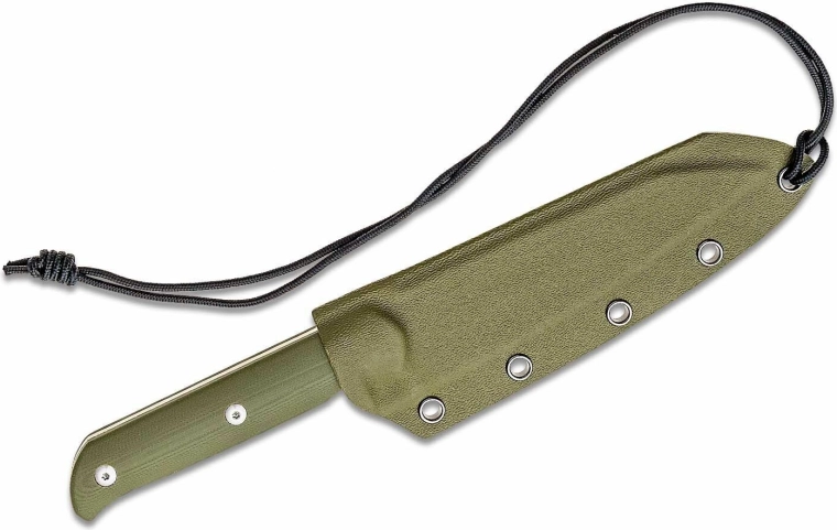 Ergonomická rukoväť z G10 v zelenej farbe je pevne uchytená tromi nerezovými nitmi a zaručuje pevný úchop aj v náročných podmienkach. Súčasťou balenia je puzdro Kydex s viacerými bodmi na uchytenie a šnúrka na pohodlné zavesenie či prenášanie.