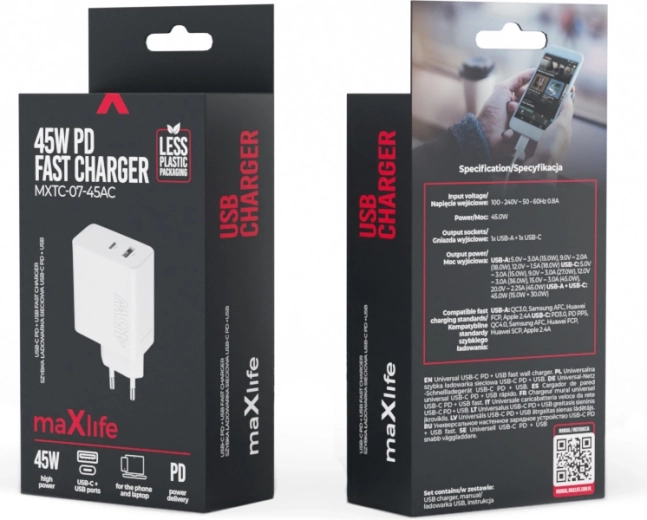 Kompaktná a odolná sieťová nabíjačka Maxlife ponúka výkon 45 W, dva porty (USB‑C + USB‑A) a podporu rýchlonabíjania Power Delivery a Quick Charge. Inteligentný systém automaticky prispôsobí prúd pripojenému zariadeniu pre rýchle a bezpečné nabíjanie telefónov, tabletov aj notebookov.