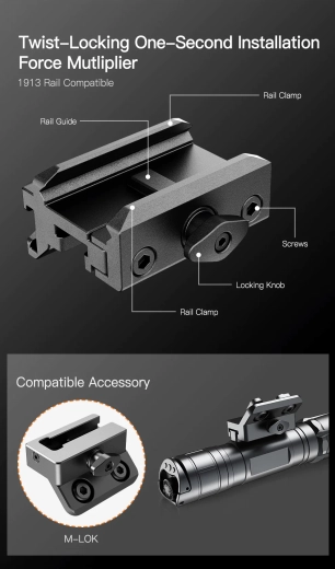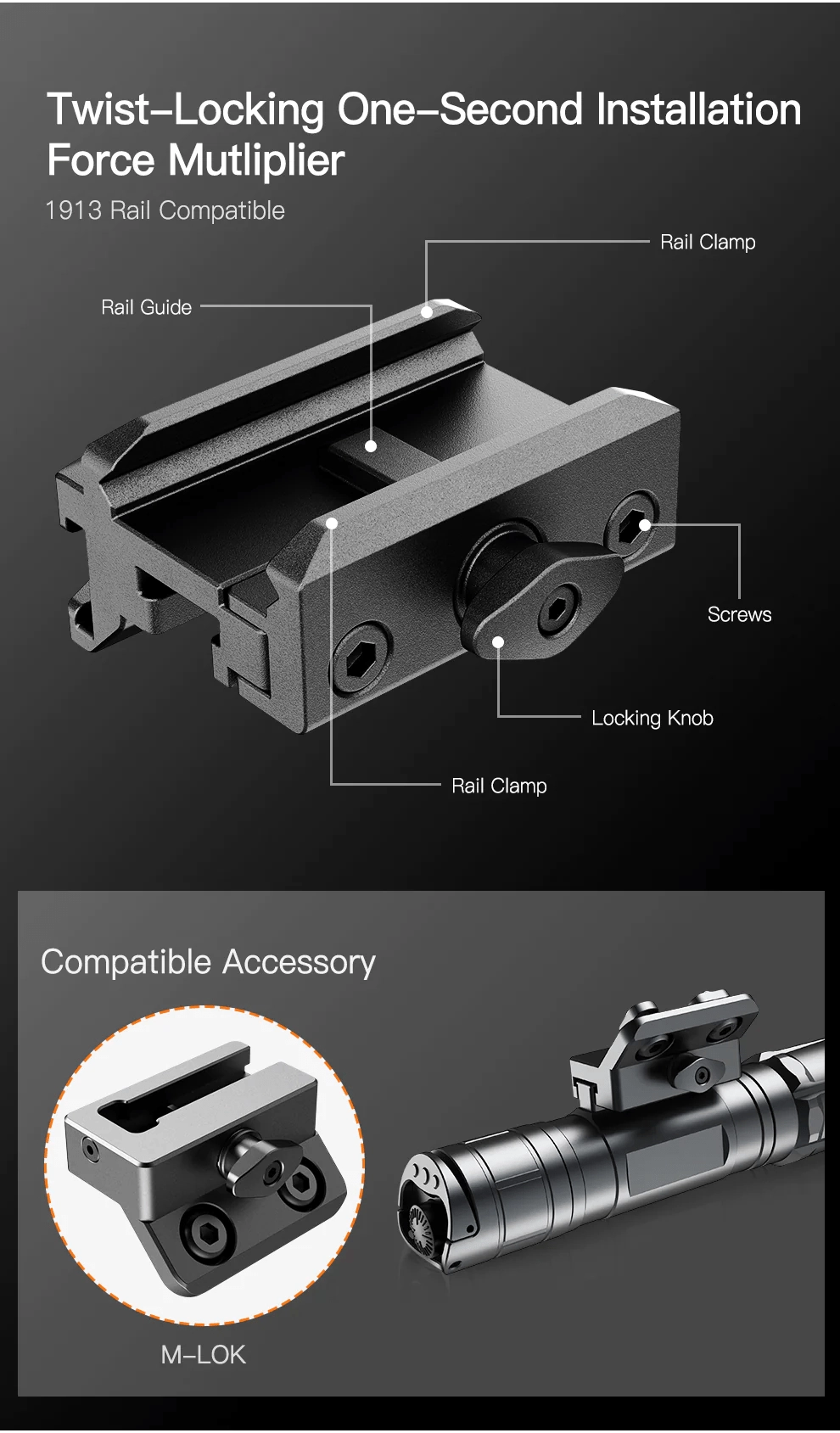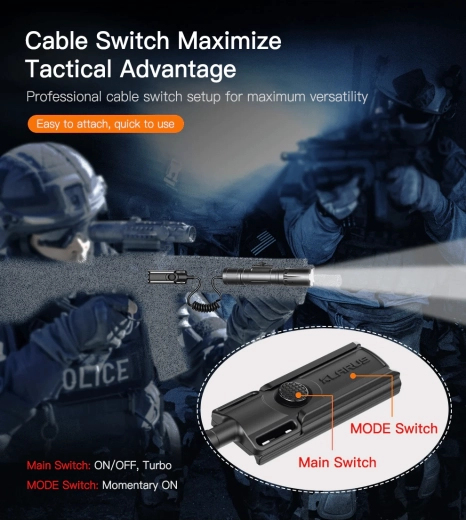Napájanie z vysoko prúdového akumulátora 21700 5000 mAh (15 A) prináša až 375 hodín prevádzky a pohodlné nabíjanie cez USB‑C. Rýchloupínacie rozhranie pre Picatinny lištu zaisťuje bezpečné uchytenie aj v rukaviciach a v úplnej tme. V balení je diaľkový káblový spínač s hlavným okrúhlym tlačidlom (zap./vyp., TURBO s trvalým svitom) a podlhovastým režimovým tlačidlom (momentové ovládanie).