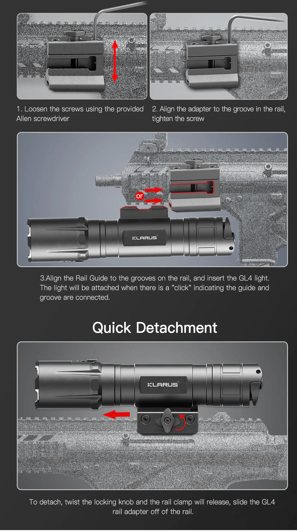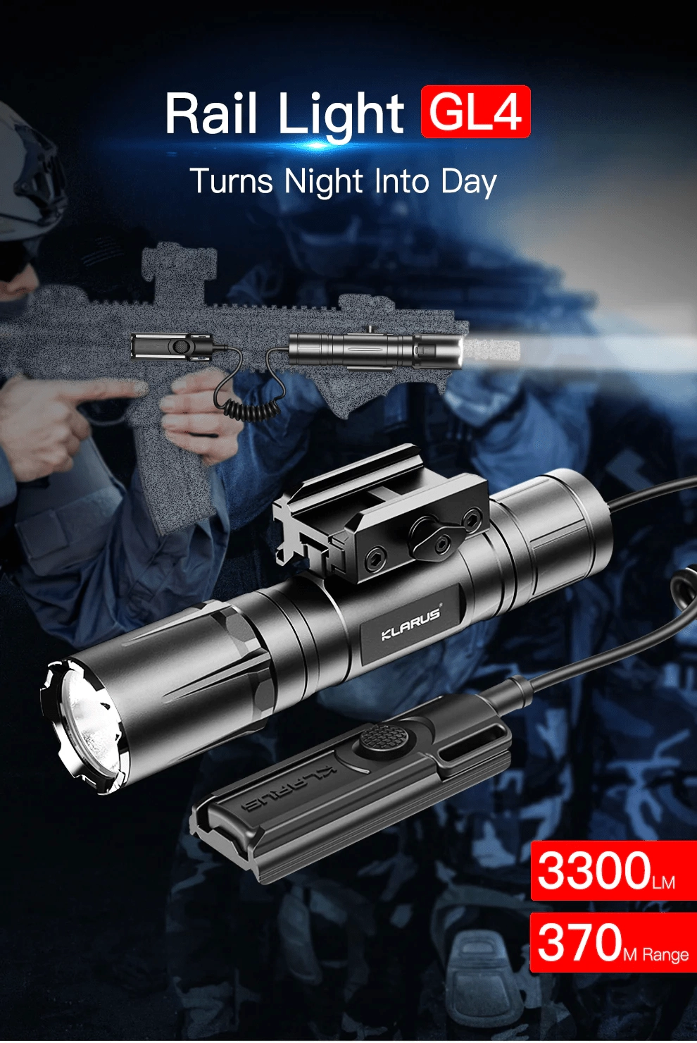 Klarus GL4 je robustné taktické LED svietidlo navrhnuté na montáž na zbraň aj náročné outdoorové použitie. Vďaka dióde Luminus a leštenému reflektoru ponúka studené biele svetlo 6500K, 3300 lúmenov a dosvit až 370 metrov. Dvojité taktické/outdoorové nastavenie a duálny spínač umožňujú bleskový prístup k TURBO a stroboskopu.