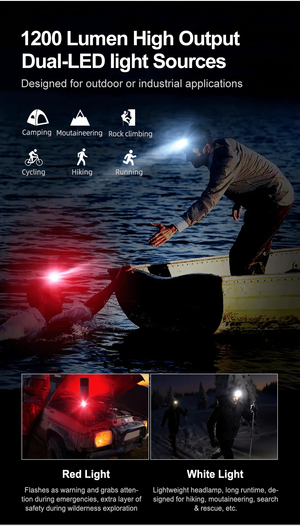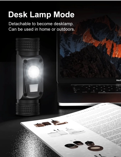 - 3 zdroje svetla: hlavná LED (až 1200 lm), bočná COB LED 4000K, červená LED (stále svetlo, blikanie, SOS)