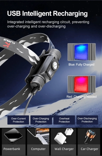Vďaka inteligentnému USB nabíjaniu s ochranou proti prebitiu a vybitiu je prevádzka bezpečná a spoľahlivá. Telo z tvrdeného leteckého hliníka 6061‑T6 odolá vode podľa IPX6 aj pádom z 1 m. Čelovku možno ľahko zložiť z popruhu a použiť ako stolovú lampu.