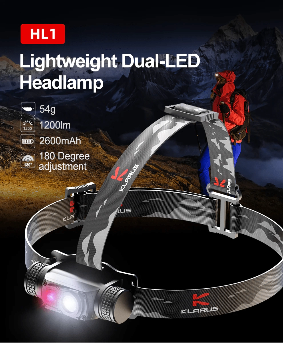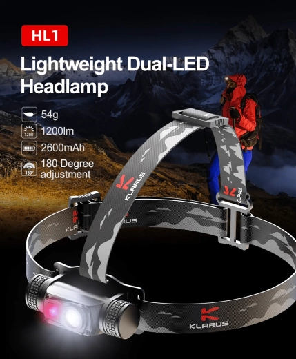 Ľahká a odolná čelovka Klarus HL1 s výkonom 1200 lm a dosvitom 125 m kombinuje bodové aj široké svetlo, umožňuje nastavenie uhla 180° a ponúka 3 svetelné zdroje vrátane červenej LED na nenápadné svietenie. Vďaka USB nabíjaniu a batérii 18650 2600 mAh vydrží až 100 hodín. Vhodná na kemping, turistiku, cyklistiku aj beh.