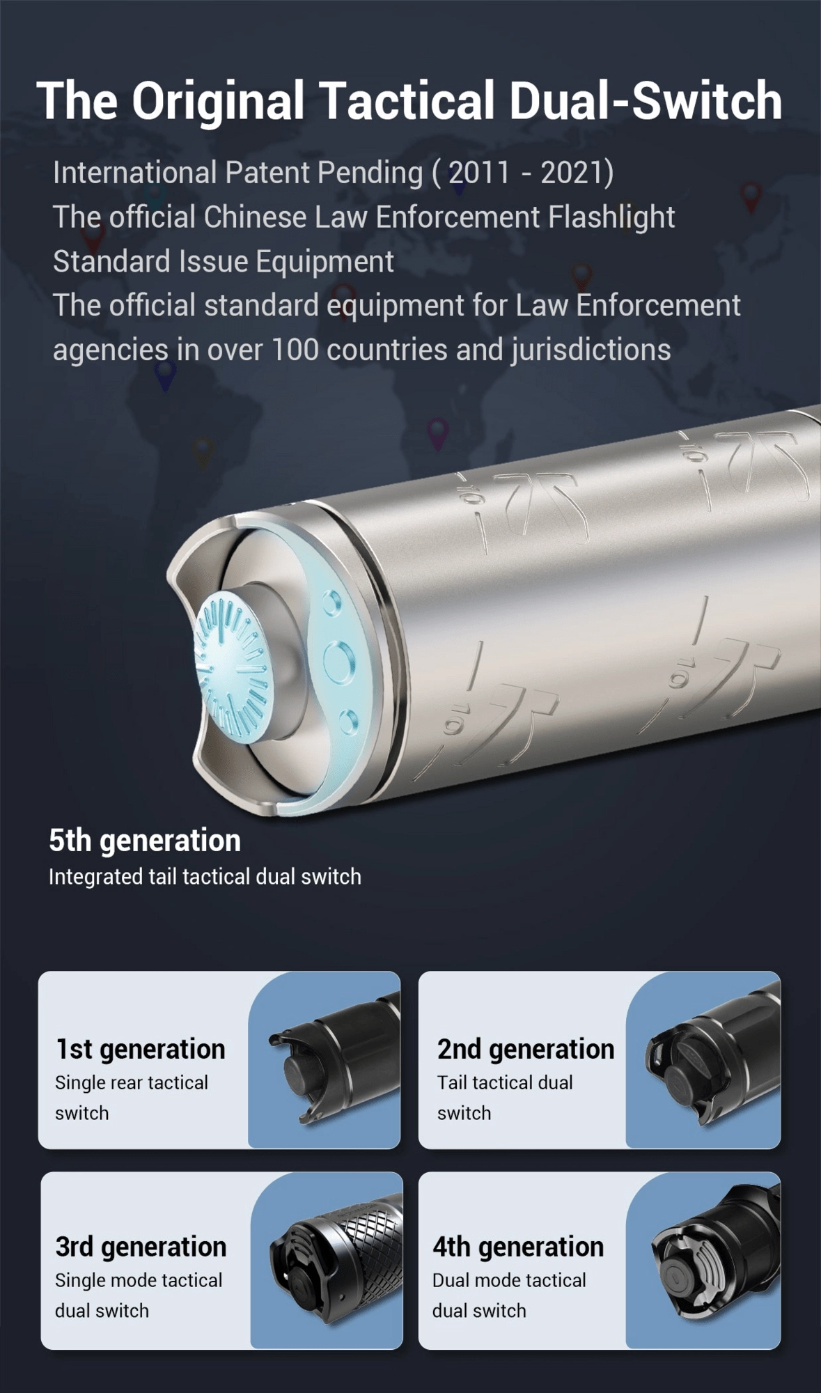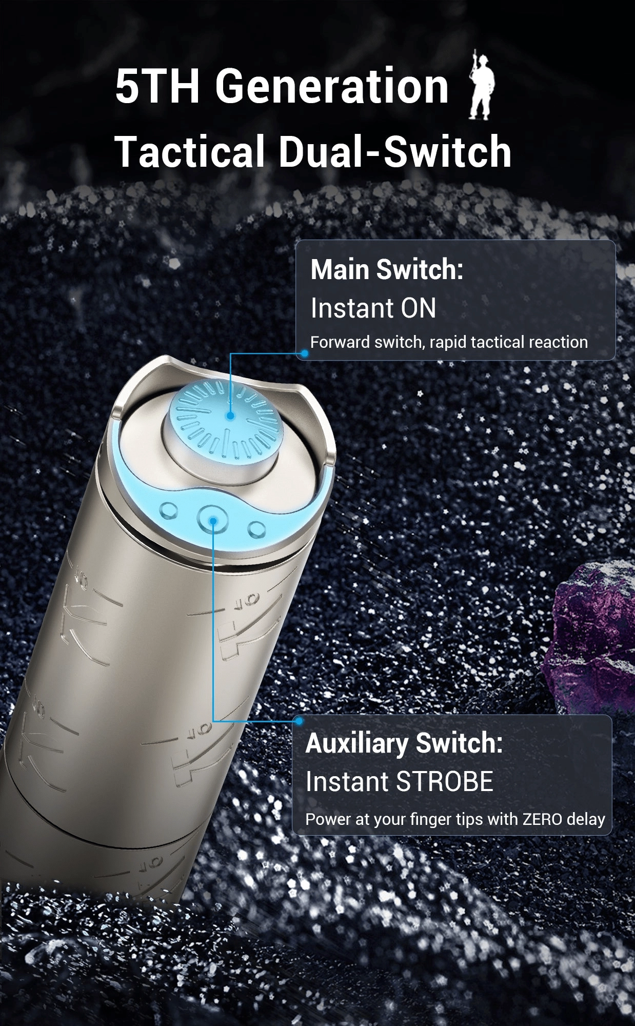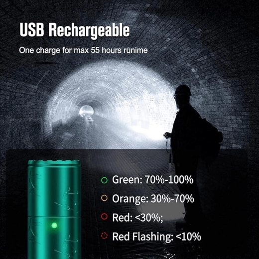 Ovládanie zabezpečuje dvojitý taktický spínač na konci baterky pre rýchly prístup k 4 režimom, stroboskopu a SOS. Napájanie rieši akumulátor 16340 Li‑ion s Micro USB nabíjaním (súčasť balenia), prípadne možno použiť aj 1× CR123A. Systém tepelnej ochrany udržiava optimálnu teplotu pre najlepšiu rovnováhu medzi výkonom a bezpečnosťou, zatiaľ čo IPX8 zaručuje vysokú odolnosť voči vode.