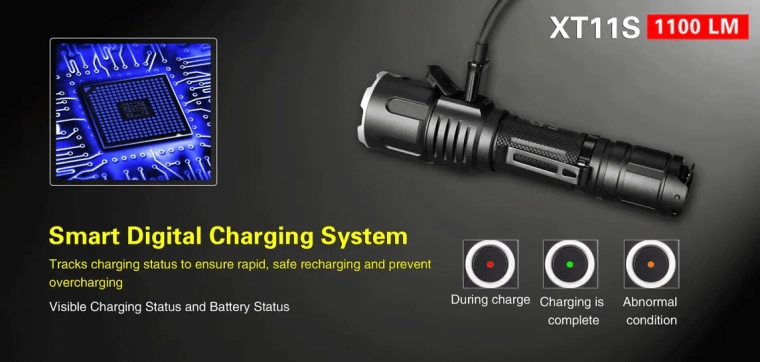 Inteligentný digitálny nabíjací systém cez micro‑USB kontroluje priebeh nabíjania a bráni prebitiu. Stav signalizujú farby: červená počas nabíjania, zelená po dokončení, blikanie pri abnormálnom stave. Konštrukcia spĺňa IPX8 (ponor do 2 m) a odolá pádu z 1 m.