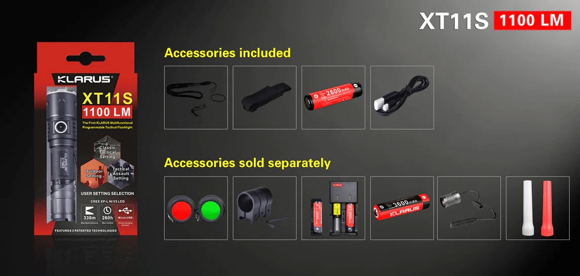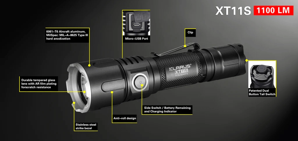 Výkonná taktická baterka KLARUS XT11S ponúka svit 1100 lm, dosvit až 330 m a výdrž až 260 hodín. Vďaka trojitému spínaču, možnostiam ovládania jednou rukou aj v rukaviciach a trom konfigurovateľným režimom je ideálna na taktické, outdoorové aj profesionálne použitie. Nabíjanie zabezpečuje micro‑USB a pribalená batéria 18650 2600 mAh; kompatibilná tiež s 2× CR123A. Odolnosť IPX8 a pád z 1 m.