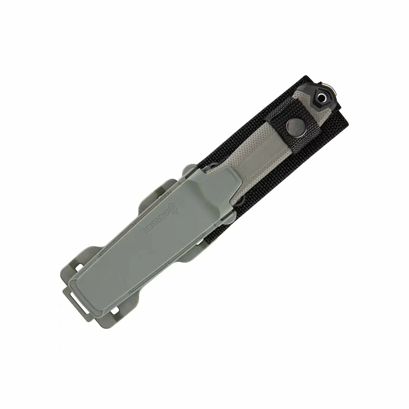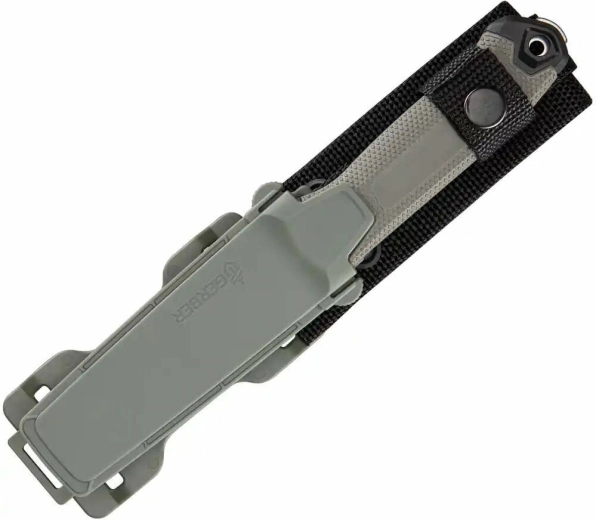 Textúrovaná rukoväť z GFN (skleným vláknom vystužený nylon) skvele sedí v ruke aj za mokra a poskytuje istý úchop. Integrované oko na paracord rozširuje možnosti uchytenia a istenia. Súčasťou je odolné plastové puzdro s modulárnym systémom uchytenia a plnou kompatibilitou s MOLLE – pre vodorovné aj zvislé nosenie na opasku, batohu či vo výstroji.
