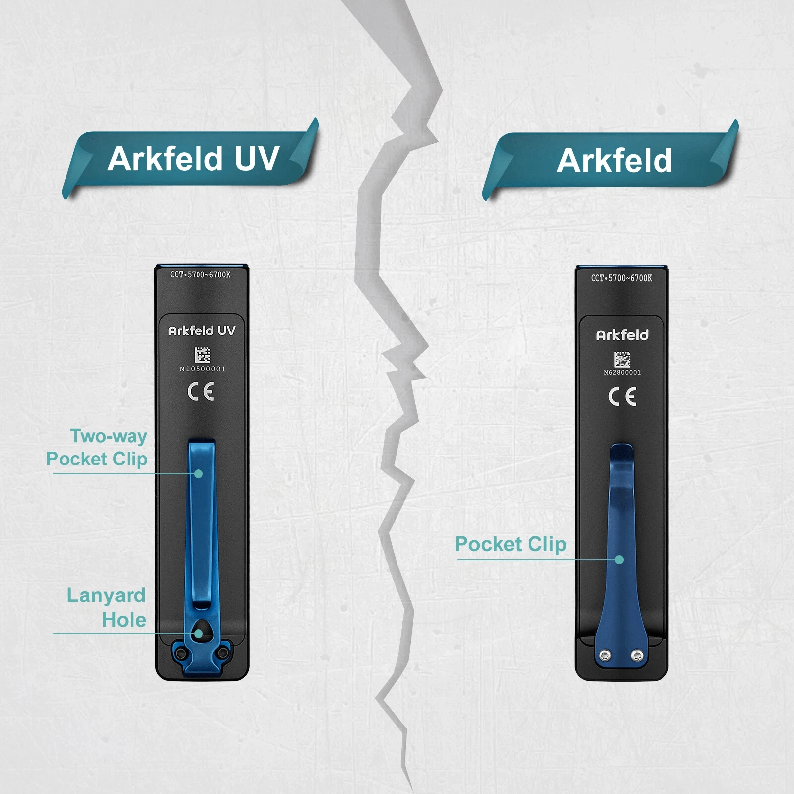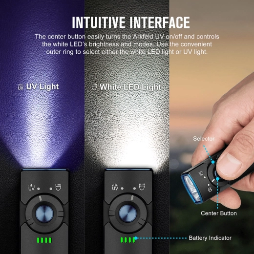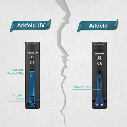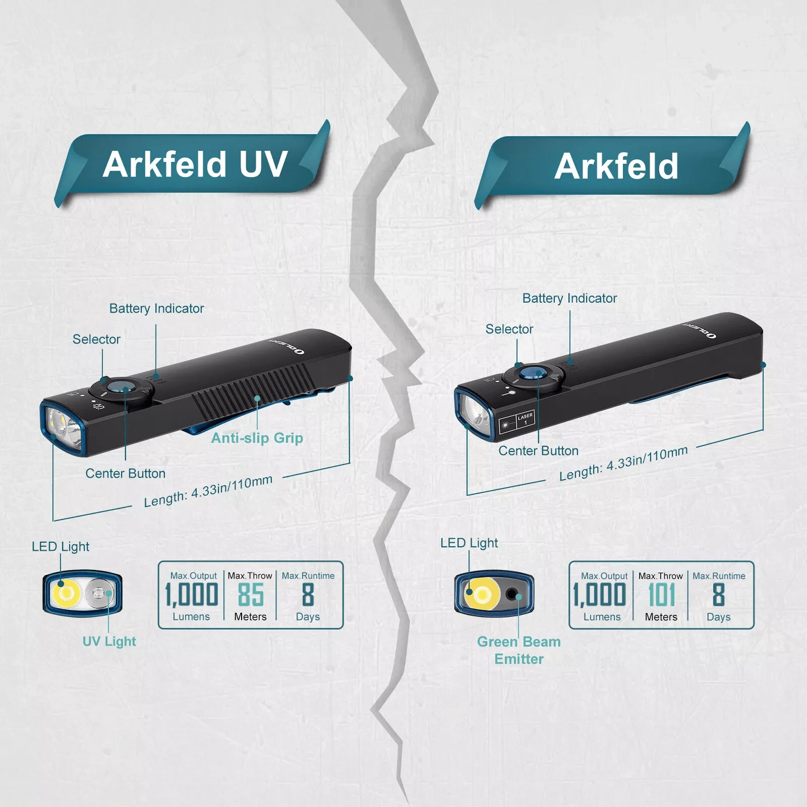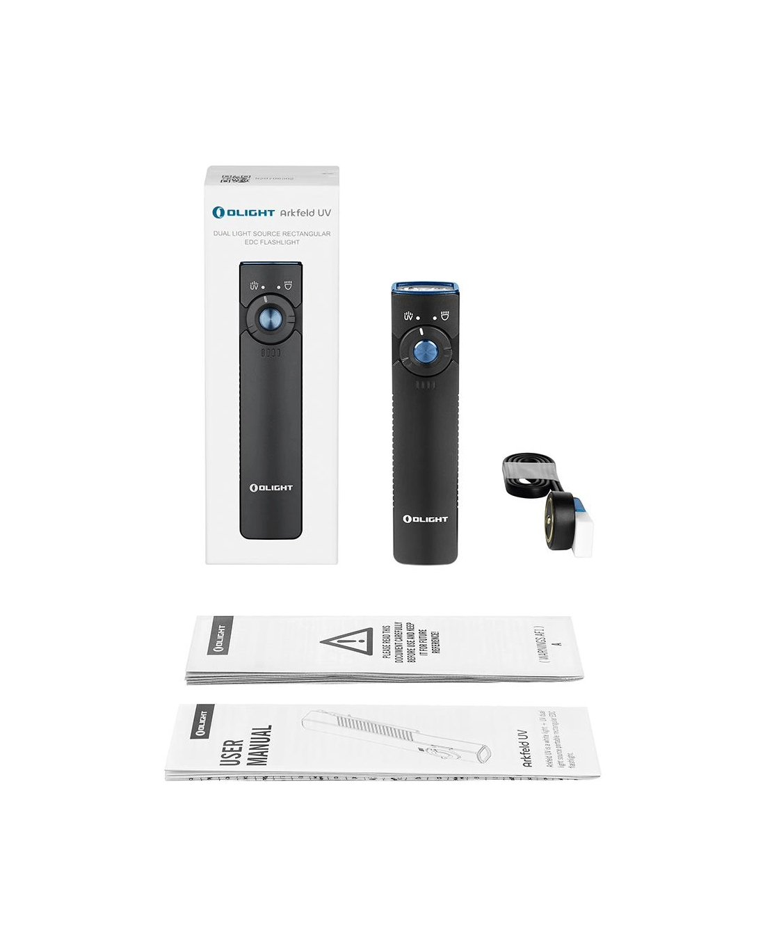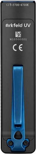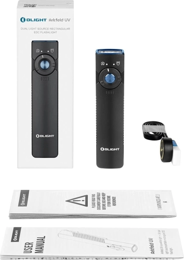 OLIGHT Arkfeld UV je EDC baterka do vrecka s jedinečným plochým dizajnom, ktorá kombinuje neutrálnu bielu LED (4000–5000 K) na každodenné svietenie a UV diódu 365 nm (580 mW) na kontrolu bankoviek, detekciu fluorescenčných minerálov či hygieny povrchov. Maximálny dosvit bieleho svetla je 85 m a špičkový výkon dosahuje 1 000 lm.