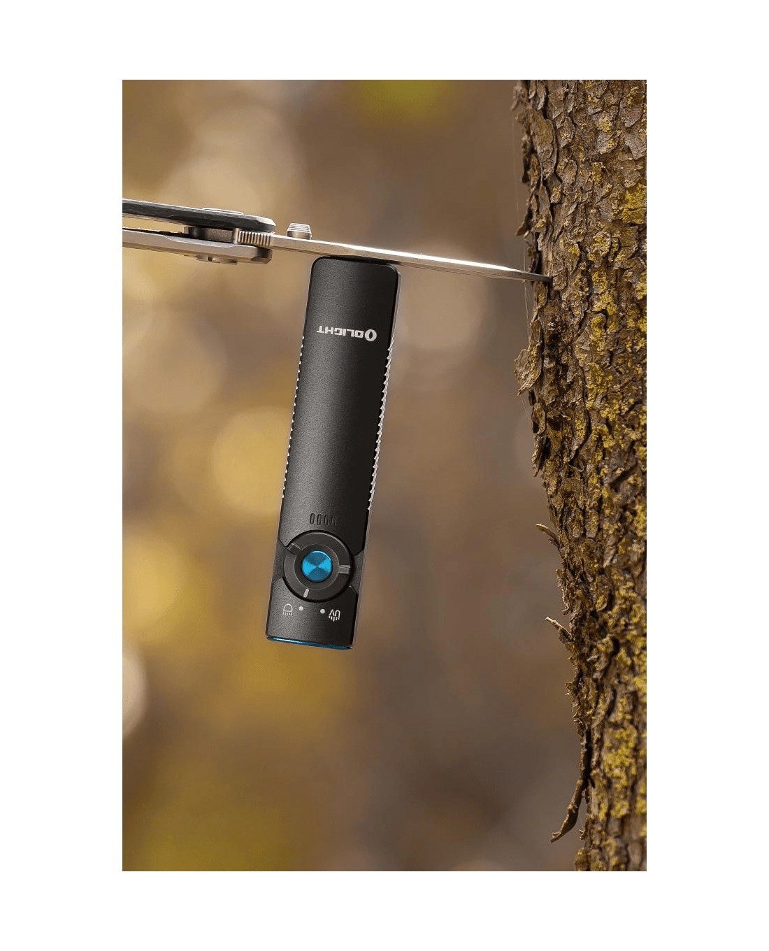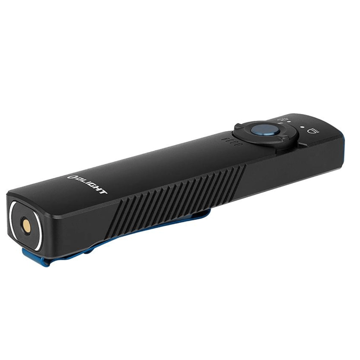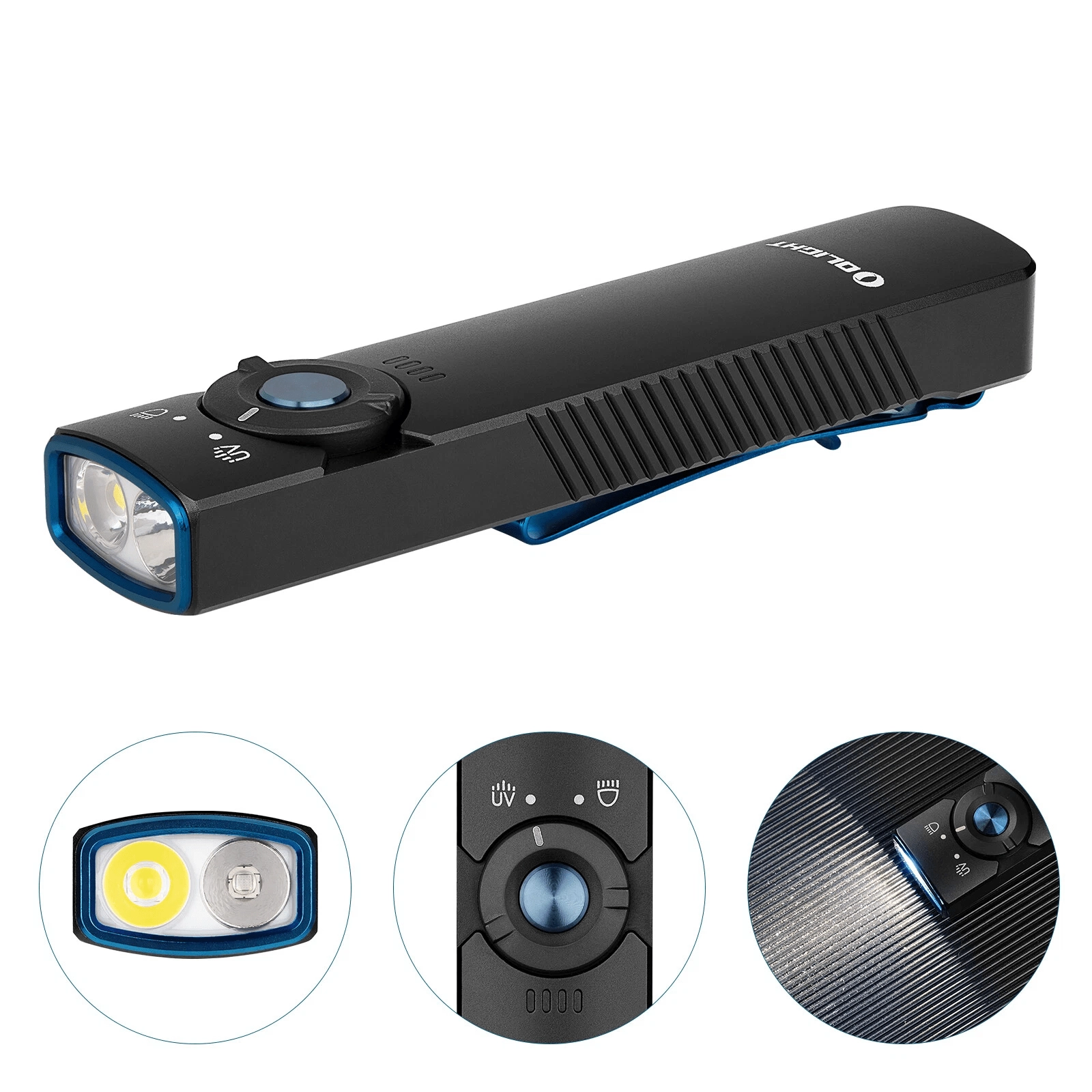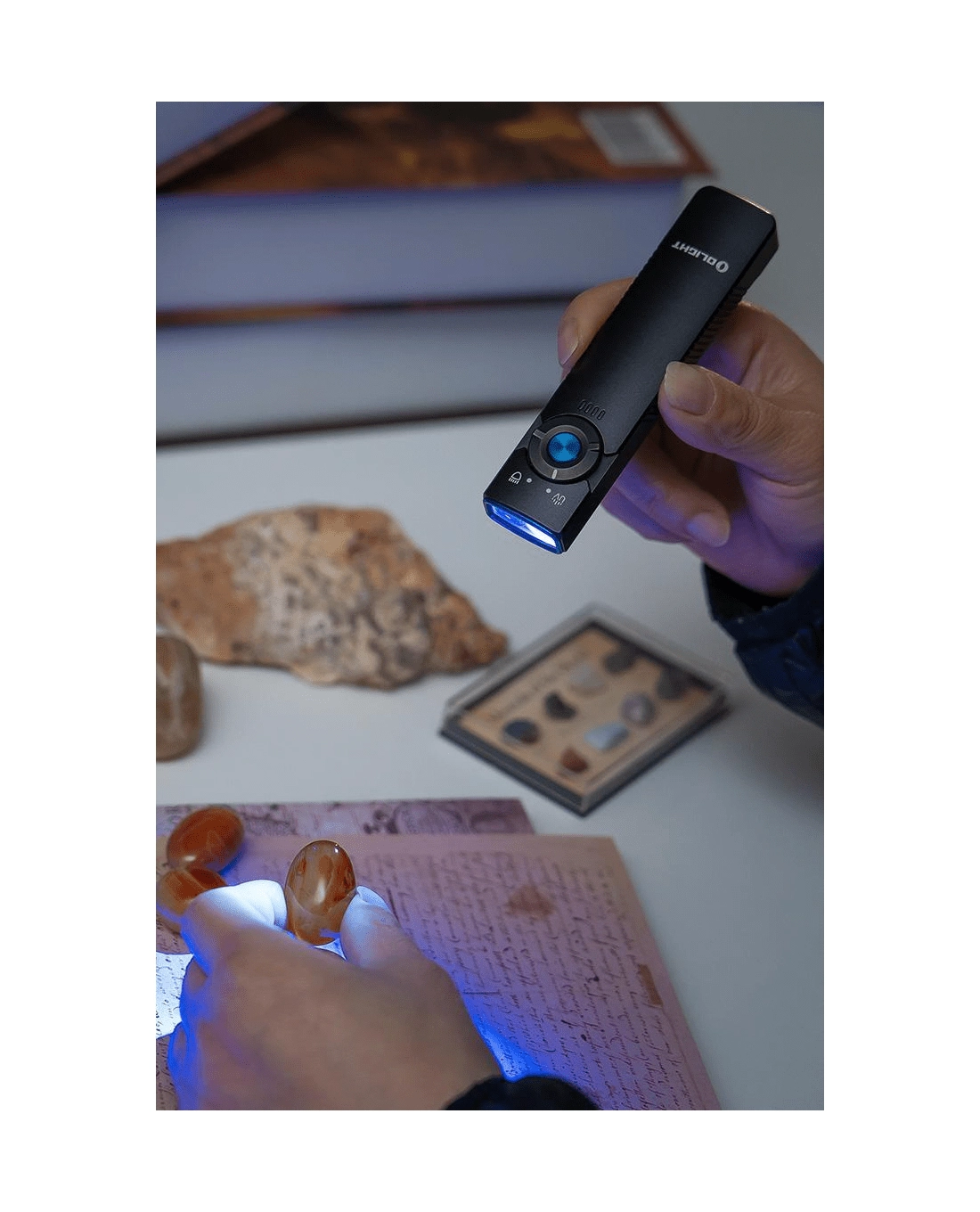 OLIGHT Arkfeld UV je EDC baterka do vrecka s jedinečným plochým dizajnom, ktorá kombinuje neutrálnu bielu LED (4000–5000 K) na každodenné svietenie a UV diódu 365 nm (580 mW) na kontrolu bankoviek, detekciu fluorescenčných minerálov či hygieny povrchov. Maximálny dosvit bieleho svetla je 85 m a špičkový výkon dosahuje 1 000 lm.