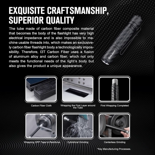 OLIGHT i3T EOS Carbon Fiber spája výnimočnú odolnosť a minimálnu hmotnosť. Telo z uhlíkových vlákien je mimoriadne pevné a pritom ľahké, takže svietidlo zaberie vrecku, na kľúčoch ani vo vašej EDC výbave takmer žiadne miesto. Vysoký výkon 180 lm a dosvit 60 m stačí na väčšinu každodenných úloh doma, vonku aj na cestách.