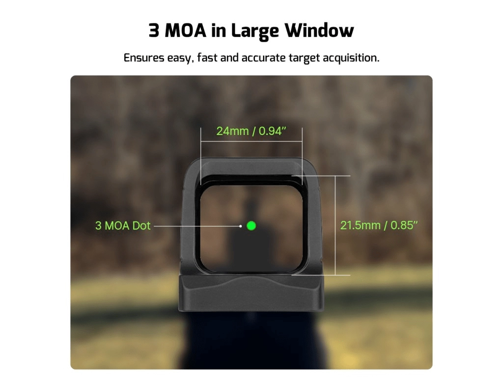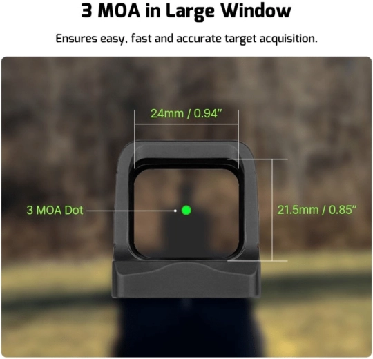 Široké okno 24×21,5 mm a jasná zelená bodka 3 MOA na bleskové získanie cieľa aj presné zásahy na vzdialenosť.