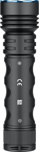 Telo z leteckej hliníkovej zliatiny s anodizáciou typu III a krytím IPX8. Kovové bočné tlačidlo a prehľadný trojfarebný indikátor stavu batérie.