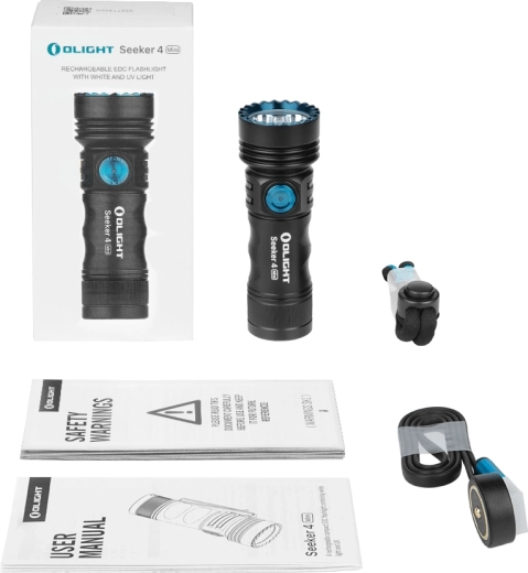 - Olight Seeker 4 Mini NW (s batériou a obojstranným klipom), šnúrka, magnetický nabíjací kábel MCC1A, používateľský manuál