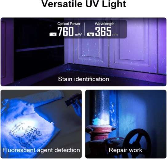 Jedna baterka na všetko: silný neutrálny biely lúč na každodenné svietenie a UV 365 nm (760 mW) na detekciu nečistôt, kontrolu dokumentov či hľadanie stôp.
