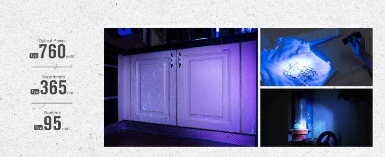 Prepínajte medzi silným bielym svetlom až 1200 lm a presným UV 365 nm (760 mW) na detekciu nečistôt, overovanie a inšpekciu povrchov.