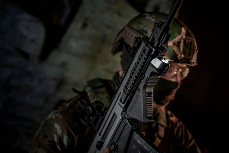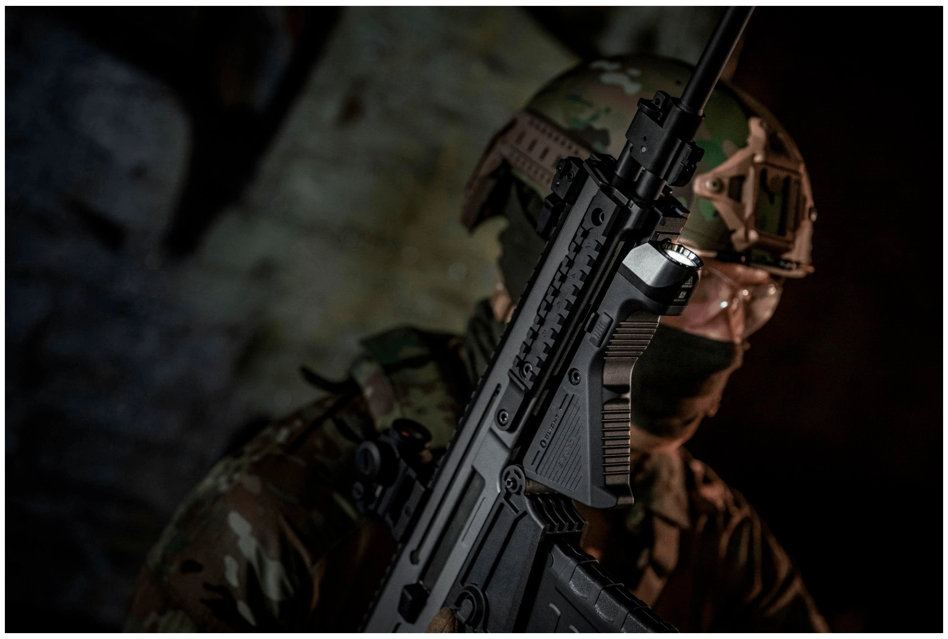 SIGURD spája taktickú baterku s uhlovou prednou rukoväťou. Protišmykové drážky zlepšujú istotu úchopu a pomáhajú lepšie zvládať spätný ráz pri rýchlych prechodoch medzi cieľmi.