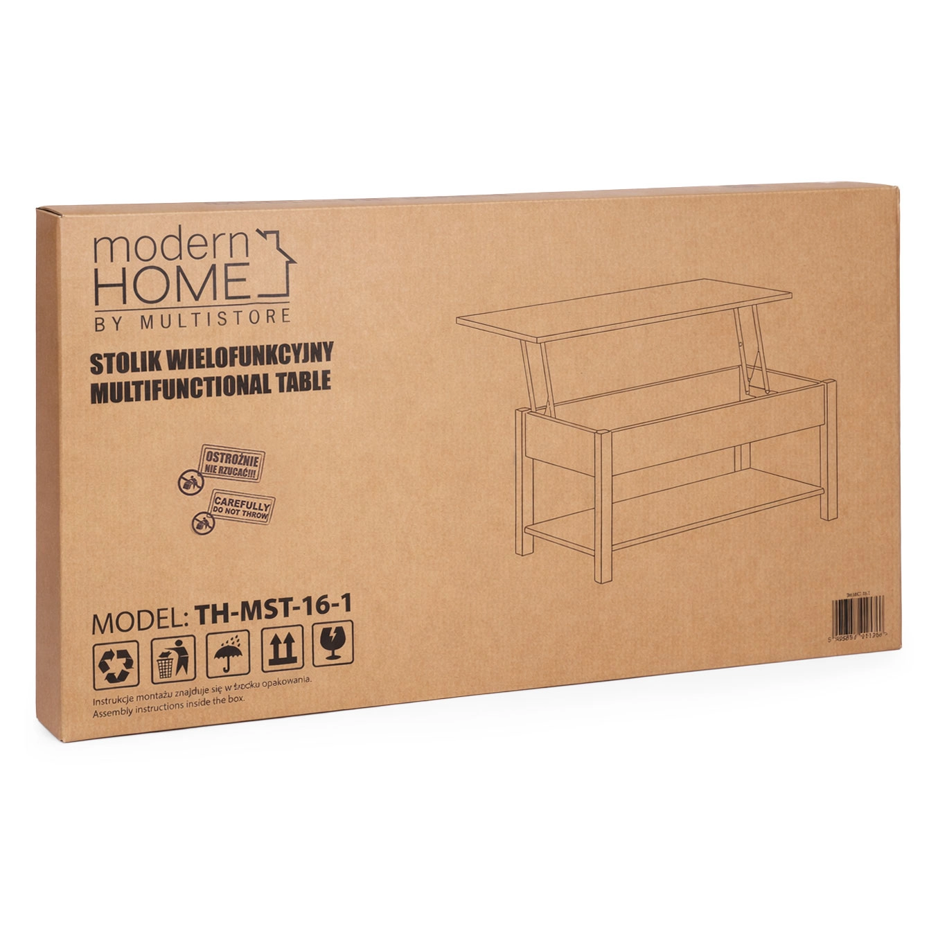 Pod doskou nájdete veľký skrytý box na ovládače, dokumenty či ďalšie drobnosti, zatiaľ čo otvorená spodná polica pojme knihy, časopisy alebo dekorácie. Kovový zdvíhací mechanizmus zabezpečuje plynulý a stabilný chod a bezpečné držanie dosky v polohe bez náhleho pádu.