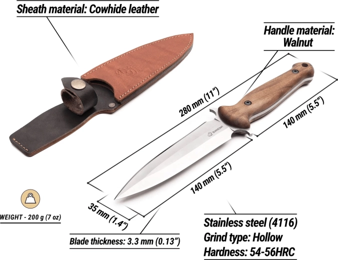 Ergonomická rukoväť z orechového dreva skvele padne do ruky a minimalizuje únavu aj pri dlhšej práci. Kovové nity pevne fixujú črienky a umožňujú jednoduchú demontáž na čistenie. Praktické kožené puzdro s pútkom na opasok a istením na patent drží nôž bezpečne na mieste, či ste na chodníku alebo v dielni.