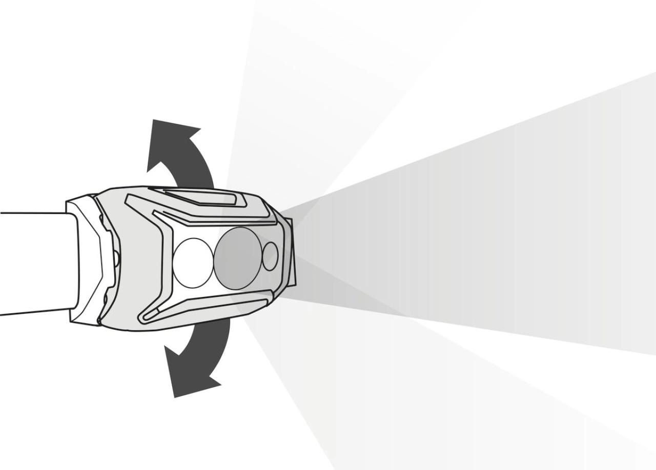 Naklápacia základňa, reflexný a prateľný hlavový pás, fosforeskujúci reflektor, funkcia LOCK proti nechcenému zapnutiu.