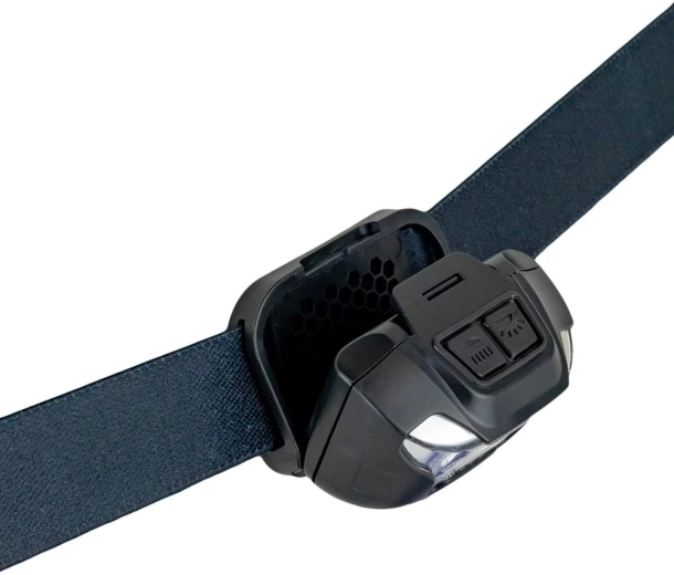 Napájanie rieši integrovaná Li‑Pol batéria 1100 mAh s USB‑C nabíjaním a prehľadnou indikáciou energie pomocou 4 modrých LED. Alternatívne je možné použiť aj 3× AAA batérie. Odolné polykarbónatové telo zvládne pády z 80 cm a krytie IP44 chráni proti dažďu a prachu. Dve horné tlačidlá zaisťujú rýchlu voľbu režimov – biele, červené (stále/blikanie) a zelené (stále).