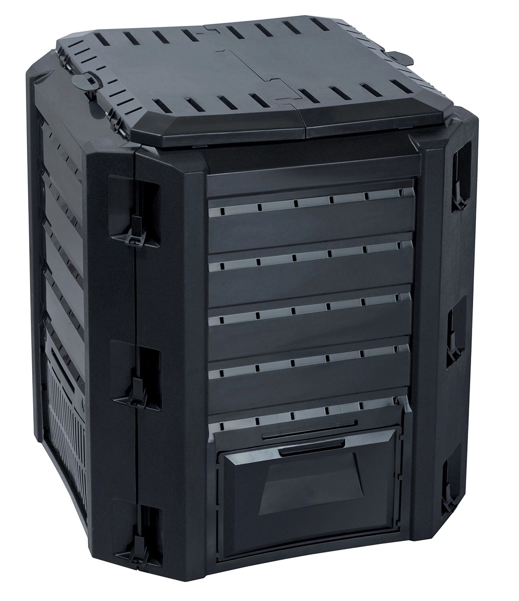 Horné veko umožňuje rýchle pridávanie materiálu, spodné servisné dvierka zas jednoduché vyberanie hotového kompostu na výživu záhonov, trávnikov a krov. Kompostér má pevné západky a panelovú konštrukciu pre rýchlu montáž a stabilitu. Elegantné čierne prevedenie nenápadne splynie s okolnou zeleňou.