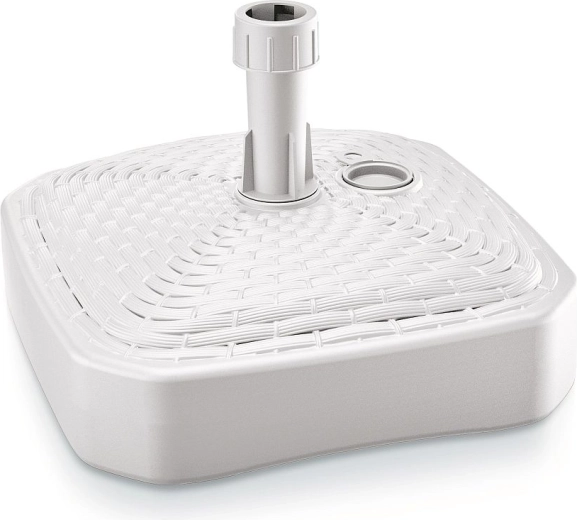 Praktický a elegantný podstavec pod slnečník UMBRELLA s rozmermi 39 × 39 cm v bielej farbe zaistí stabilnú oporu pre slnečník na záhrade, terase aj balkóne. Je vyrobený z odolného plastu s UV ochranou, možno ho naplniť vodou alebo pieskom až do 12 l a je kompatibilný s tyčami s priemerom 24–30 mm.