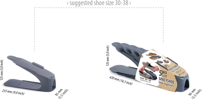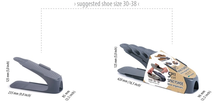 Vďaka flexibilnému tvaru pojmú organizéry rôzne typy obuvi – od sandálov a tenisiek až po mokasíny či lodičky – s maximálnou výškou do 12 cm. Protišmykový povrch zabezpečuje stabilitu a bráni zosúvaniu. Odolný plast je ľahký, pevný a ľahko sa čistí, takže údržba zaberie minimum času.
