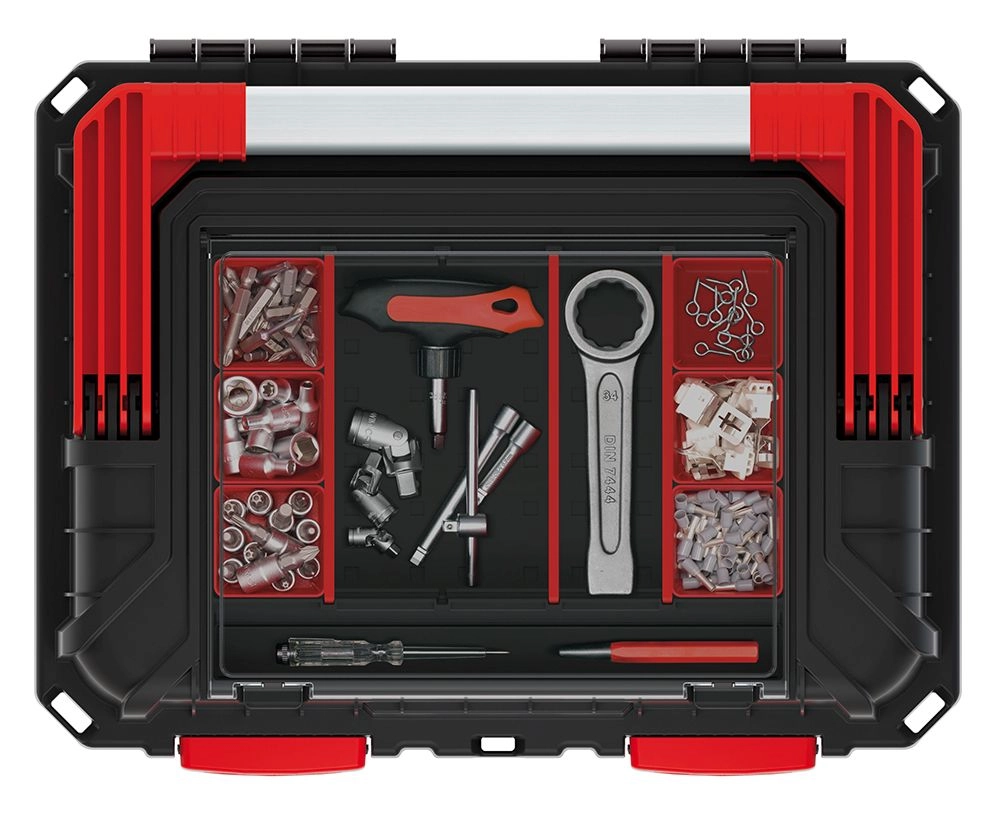 Vnútorné usporiadanie s vyberateľnou vložkou pomáha triediť skrutkovače, kliešte a drobný materiál. Vonkajší priečinok potom poskytuje okamžitý prístup k najčastejšie používaným položkám, ako sú bity, hmoždinky či meter. Praktické rozmery 445 × 360 × 337 mm ponúkajú dostatok priestoru a pritom zachovávajú dobrú prenosnosť.