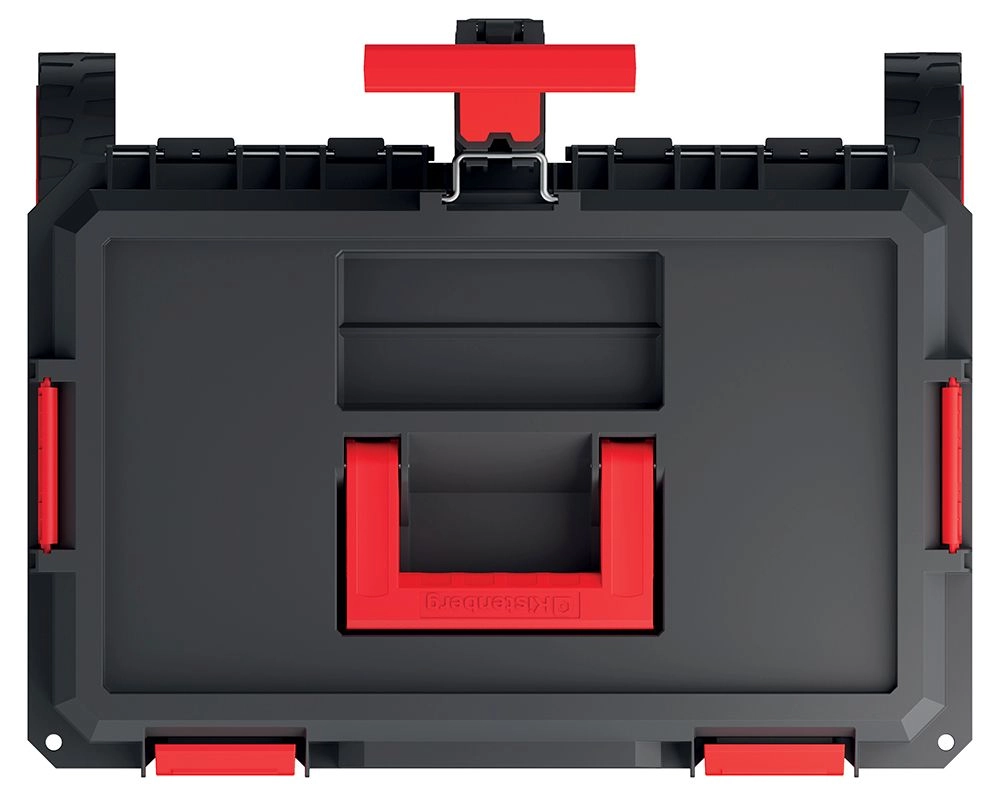 Spevnené rohy, pevné veko a istiace západky chránia obsah pred nárazmi a udržia náradie bezpečne uzavreté pri transporte.