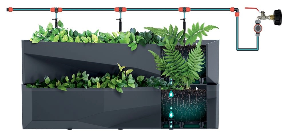 Nadbytočná voda steká do spodných kvetináčov pre rovnomernejšiu vlhkosť. Možno doplniť kvapkovú závlahu pre ešte pohodlnejšiu starostlivosť.