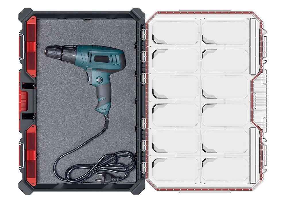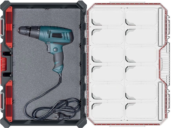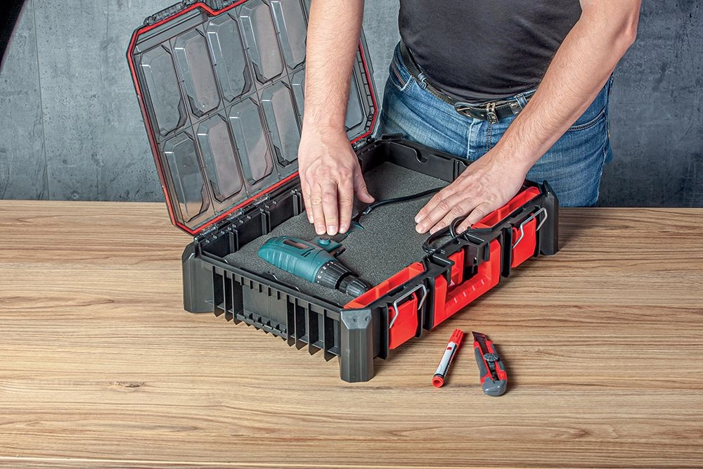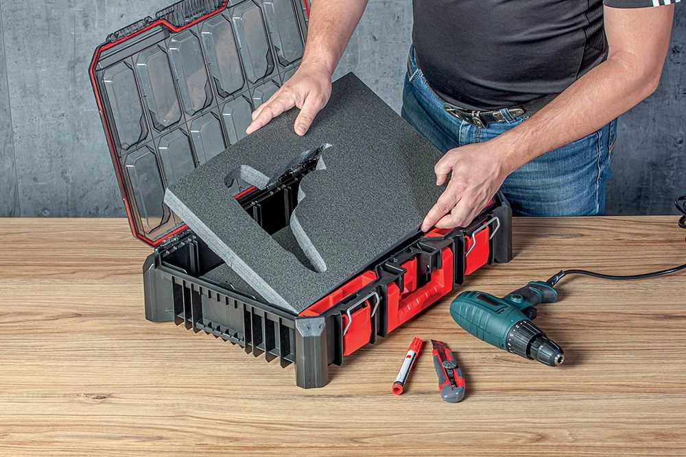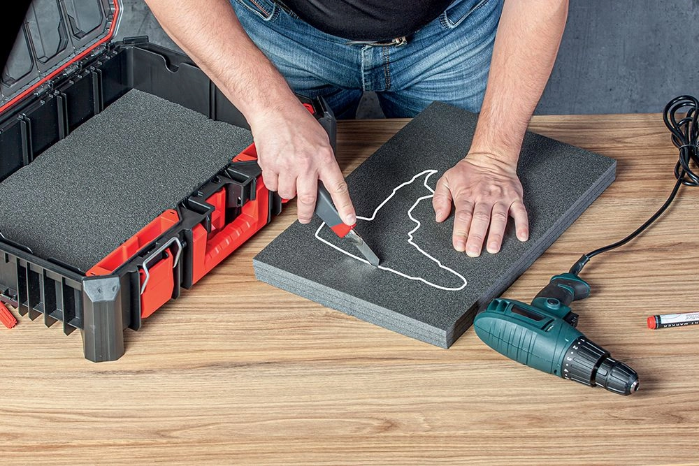 Vytvorte presné výrezy pre vŕtacie skrutkovače, meradlá či príslušenstvo – stačí fixka a ostrý nôž. Náradie drží pevne na mieste a je chránené pred poškodením.