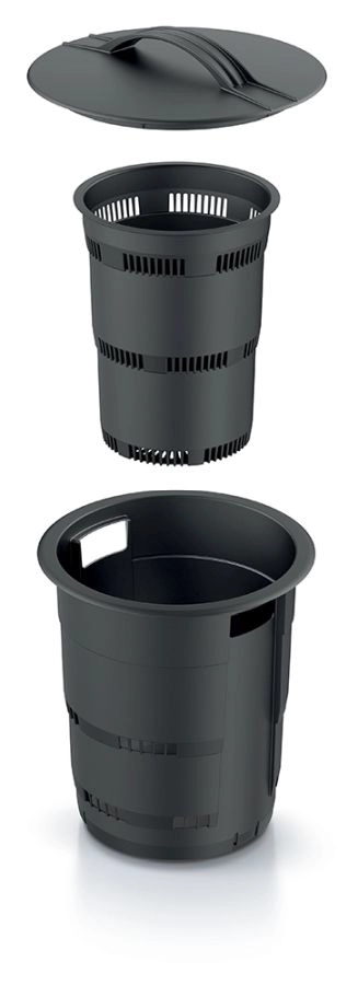 Perforované steny umožňujú prúdenie vzduchu a prienik dážďoviek, čo urýchľuje rozklad bioodpadu a prirodzene vyživuje okolité rastliny.