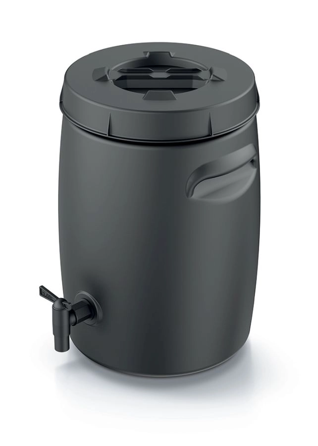 Robustná plastová nádoba s vekom je navrhnutá pre jednoduché plnenie, čistenie a údržbu. Integrovaný kohútik umožňuje presné dávkovanie priamo do kanvy, zatiaľ čo vetrané veko bráni množeniu hmyzu a nežiaducemu zápachu.