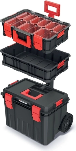 Sada MODULAR SOLUTION 3v1 je ideálnym pomocníkom pre remeselníkov aj domácich kutilov, ktorí požadujú flexibilné a systémové ukladanie náradia. Elegantné čierne kufre sú vyrobené z odolného plastu, ktorý lepšie odoláva mechanickému opotrebeniu a každodennému používaniu. Modulárny systém umožňuje rýchlu zmenu konfigurácie – od samostatného boxu po kompletnú mobilnú vežu s teleskopickou rukoväťou a kolieskami.